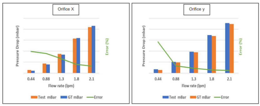 从下图的分析结果中可以看到,在不同流量的情况下,GT-SUITE计算的冷板压降与测试值平均误差较小,在低流量的情况下,误差稍偏大;在高流量时,误差率不到1%。